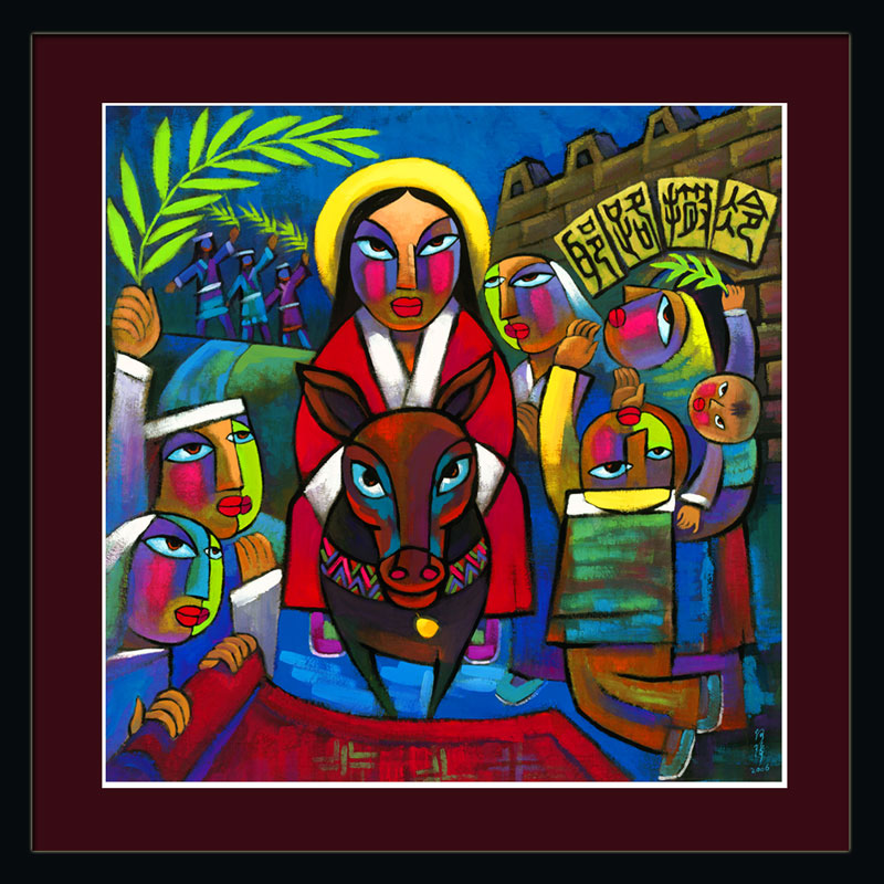 Are you familiar with the artist He Qi? He is my favorite contemporary Scripture artist. The colors he uses are quite vibrant, loud even. I appreciate how the people depicted in the pictures are not clearly gendered, there is an andrognyous appearance to some of the people. There is movement to his art and the gazer is invited into the scene that Dr. He Qi is creating. Here is his depiction of Jesus triumphanal entry into Jerusalem. Notice the movement in the crowd. They are kneeling, head titled backwards, standing with arms outreached, hand over mouth, and hands reached out. You can almost hear the people crying out “Hosanna, save us!” The donkey’s gaze is piercing. Is the donkey looking right at us? Does the donkey know its mission? A child in my congregation interpreted the story of Palm Sunday by saying she was most struck by the fact that the donkey had to give its permission before Jesus could ride on it. I love that! Since John is the only Gospel that mentions palms we see a mulit-gospel representation in this piece. Leafy branches, palms, and cloaks are being offered before Jesus.